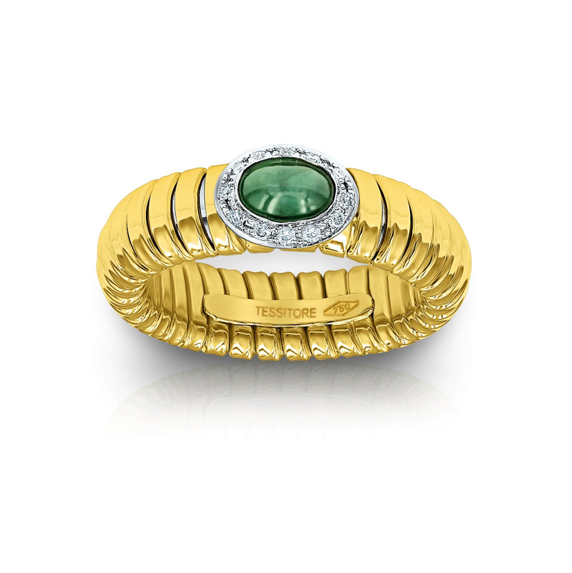 ● Stackable bands with emerald accents for modern layering